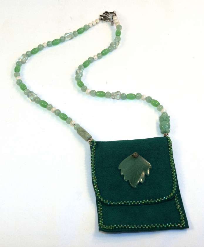 This one of a kind “Owl Talisman” Convention Goers Necklace was handmade by prolific fantasy novelist, Mercedes Lackey especially for the RealWorldHero auction! The front of this soft green leather pouch is decorated with an elegantly simple jade colored leaf and is chased around the edges with tiny iridecent green seed beads in a modified peyote stitch. The necklace is strung with a variety of jade colored glass beads and silver accents and a detailed jade owl that perches protectively on the right side of the pouch. The clasp is a silver bar and toggle with a leaf motif, echoing the leaf on the front of the pouch. The pouch is designed to hold your personal effects at a convention and is perfectly sized to hold your drivers license, credit cards, cash and hotel key. Comes with signed “Handmade by Mercedes Lackey” card.