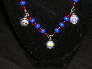 This City of Heroes Enhancement Necklace was designed and handmade exclusively for Real World Hero by player @One Hit Wonder. The necklace measures approximately 20″ long and has six red and blue beaded sections (using glass and plastic beads) and seven charms featuring the icon for an enhancement in City of Heroes.